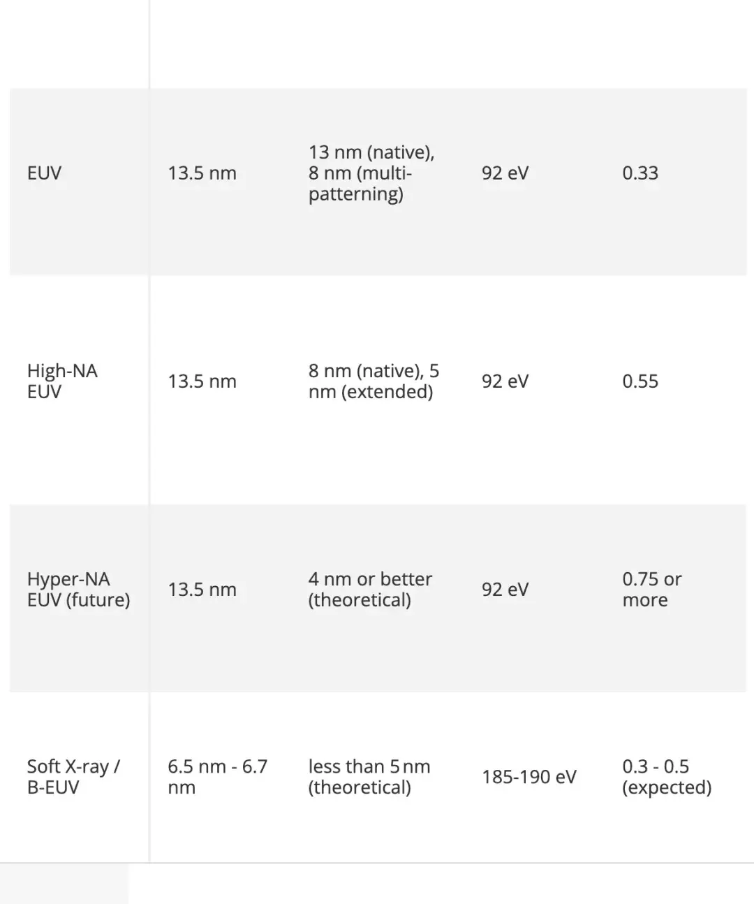 至于文章开头谈到6.7nm波长之所以被看到是下一个选择,那是因为它具备第二高的反射率,大约是 13.5 nm 的一半。从理论上看,我们可以建造这个波长的 EUV 机器。但这里有一些需要注意的地方: