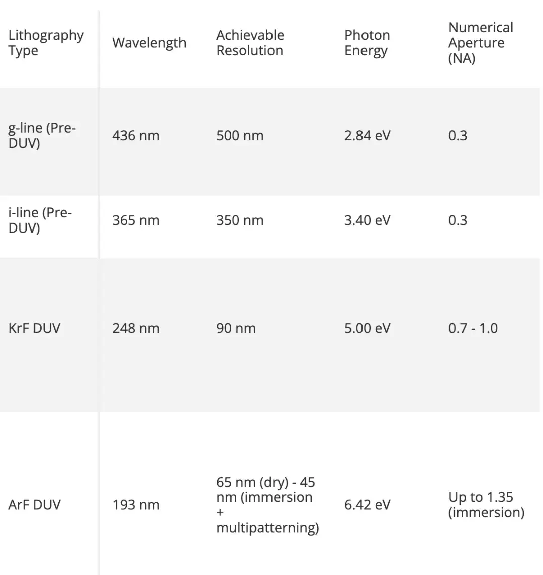 而之所以会是这样的演进步伐,则是科学家们基于对这些设备及物理原理考量实现的。以DUV和EUV为例,DUV 由准分子激光器产生。研究人员测试了大量气体以识别高发射效率的发射器。最终,他们得到了一些良好的发射器,如 KrF(248 nm)、ArF(193 nm)和 F2(157 nm),并基于它们开发了光刻机。
