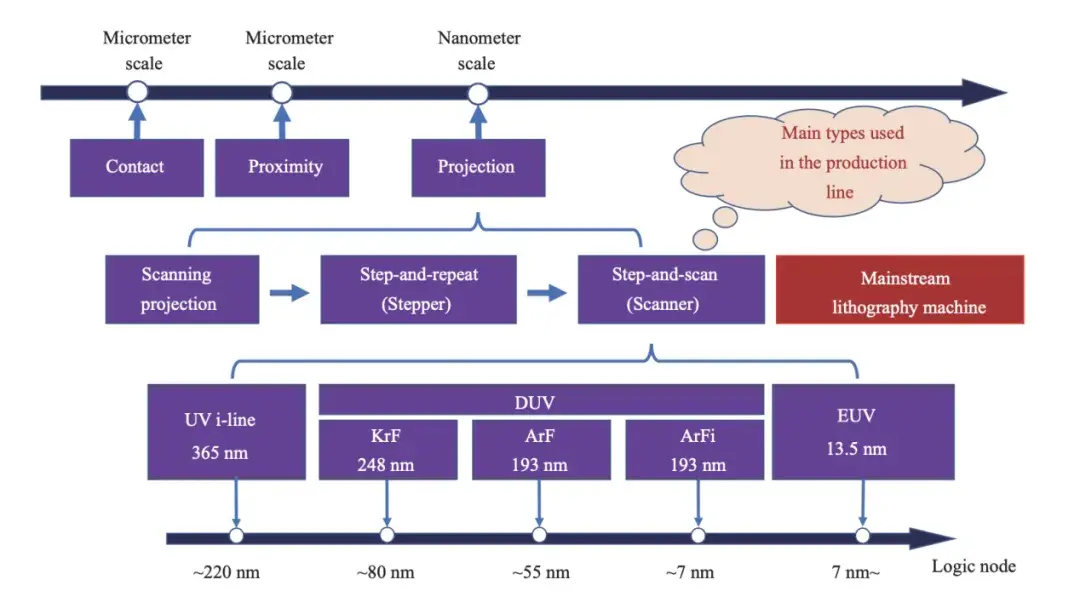 具体到波长方面,如文章《集成电路装备光刻机发展前沿与未来挑战》所说,自1961年第一台光刻机诞生以来,光刻机经历了接触式→接近式→投影式的发展路线,如今以投影式中的步进扫描式光刻机为主流。光刻机所使用的光源波长从最早的紫外光源(ultraviolet, UV),如g线(波长436 nm)、i线(波长365 nm)光源,发展到以KrF(波长248 nm)、ArF(波长193 nm)为代表的深紫外光源(deep ultraviolet, DUV),再到现在波长13.5 nm的极紫外光源(extreme ultraviolet, EUV)。